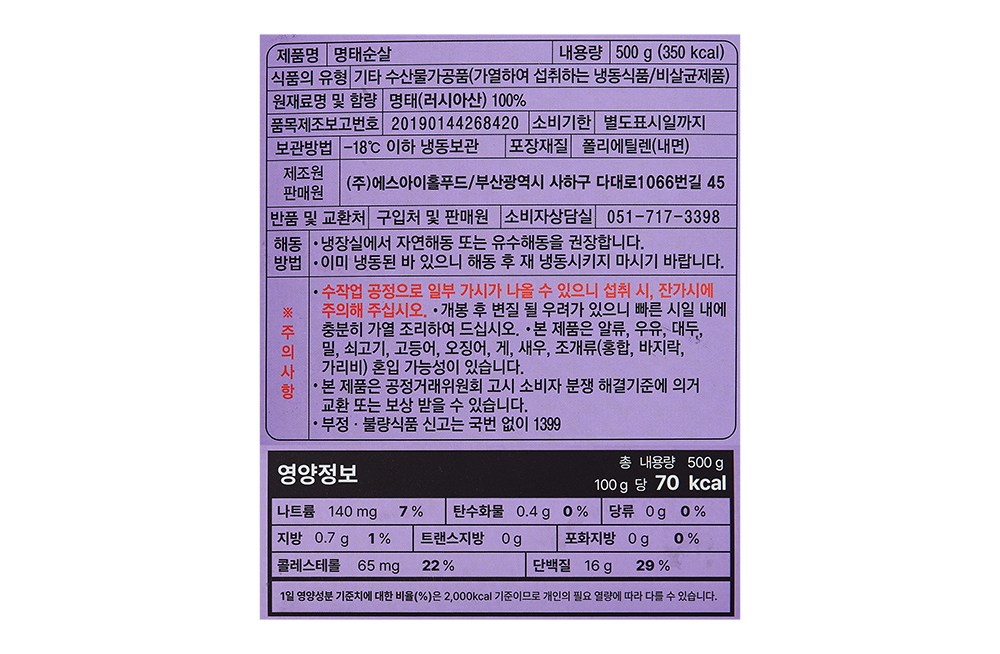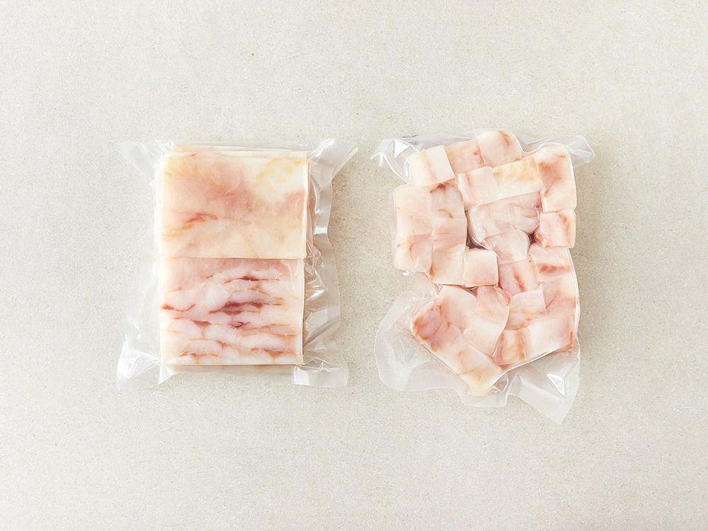 · 슬라이스와 큐브 두 가지 형태로 손질된 명태 순살이 각각 소포장 되어 있습니다.