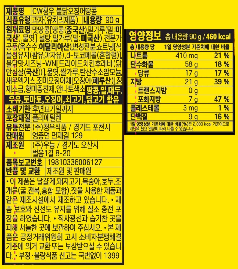| 포장단위별 내용물의 용량(중량), 수량 | 90g * 16개, 1개 | 원재료명 및 함량 | 컨텐츠 참조 |
