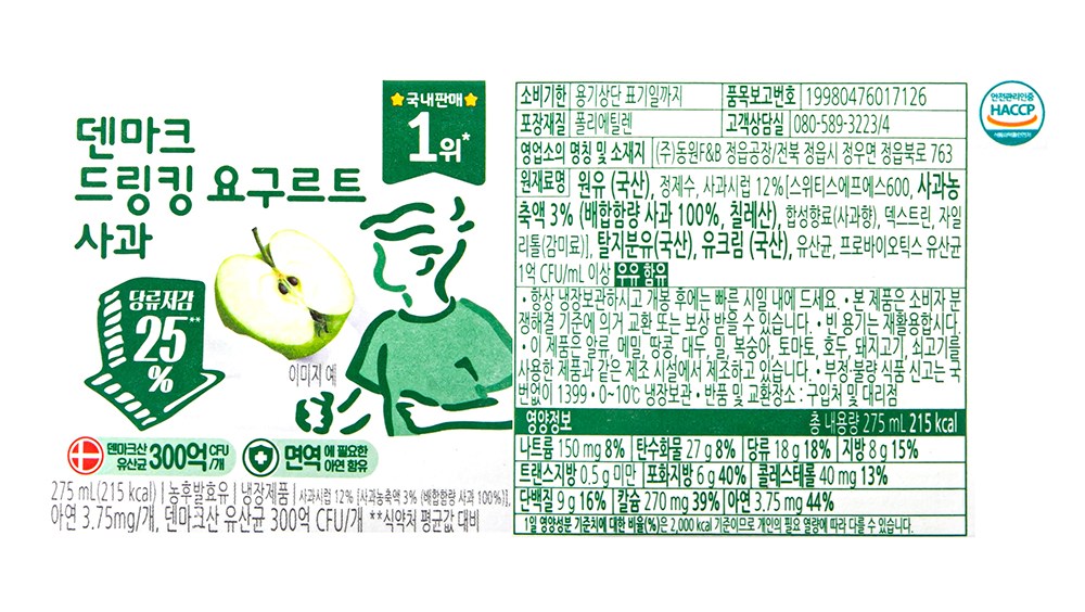 | 제품명 | 덴마크 드링킹 요구르트 사과 | 식품의 유형 | 농후발효유 |