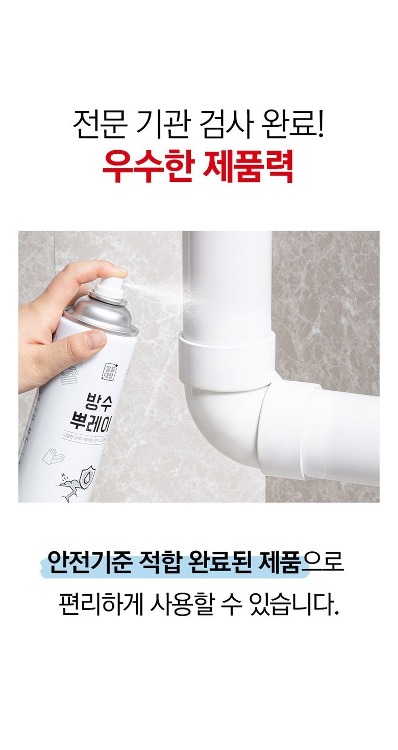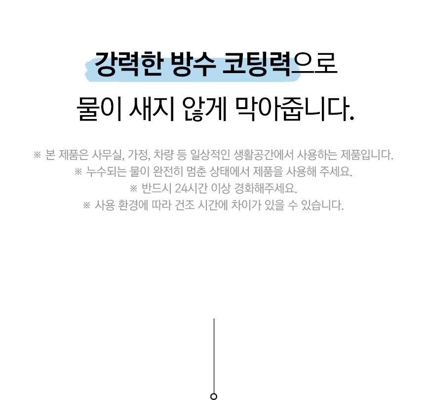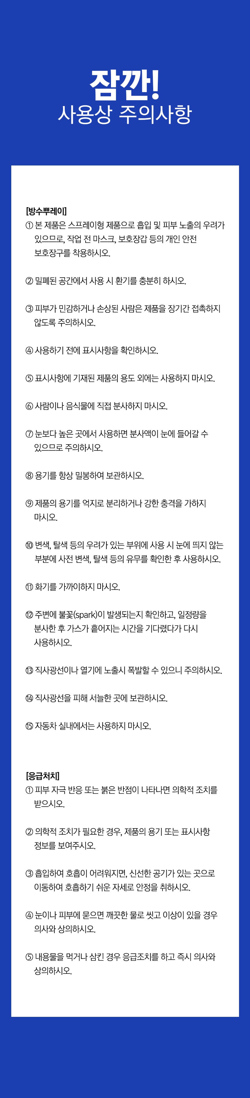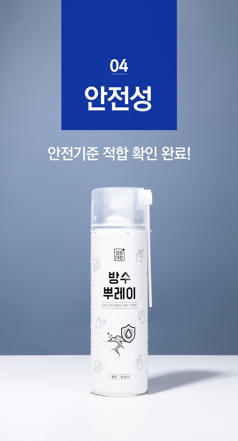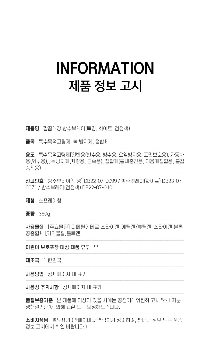 | 품목 및 제품명 | 특수목적코팅제,접합제,녹 방지제/방수뿌레이(투명) | 용도(표백제의 경우 계열을 함께표시) 및 제형 | 일반용-발수용,일반용-오염 방지용,일반용-표면보호용,자동차용-외부용,일반용-방수용,흠집충진용,이음매접합용,틈새충진용,금속용,차량용/분사형-스프레이형 |