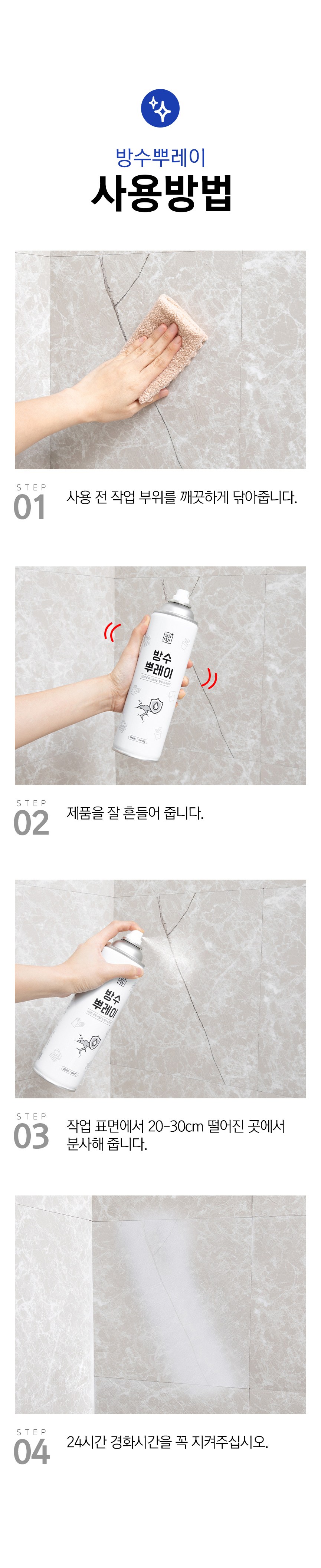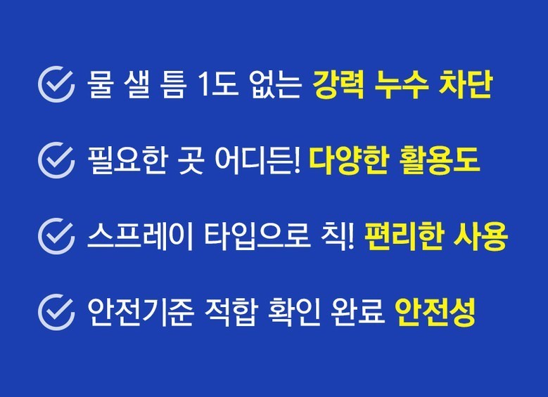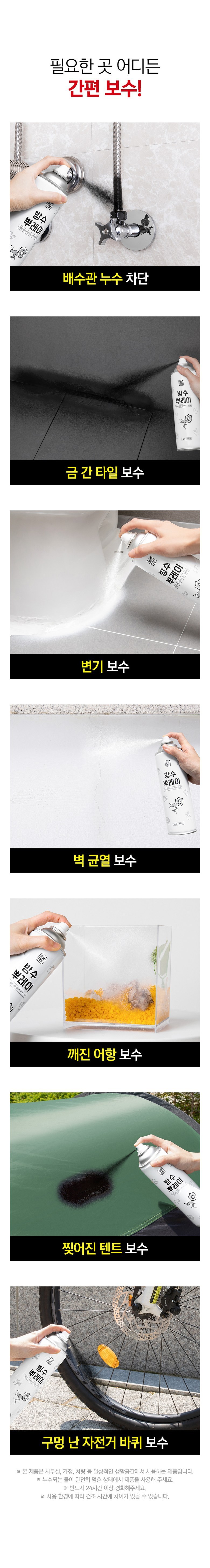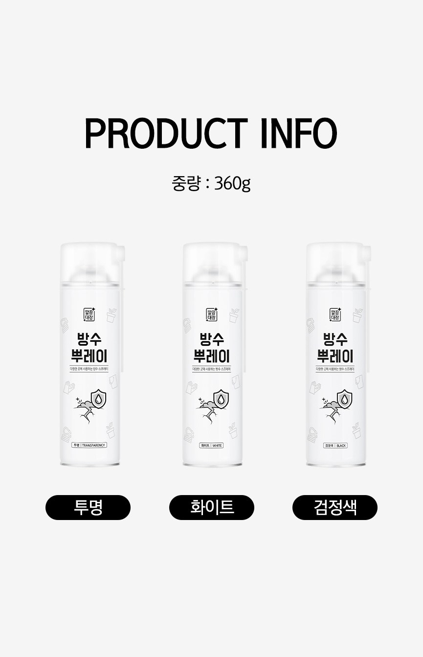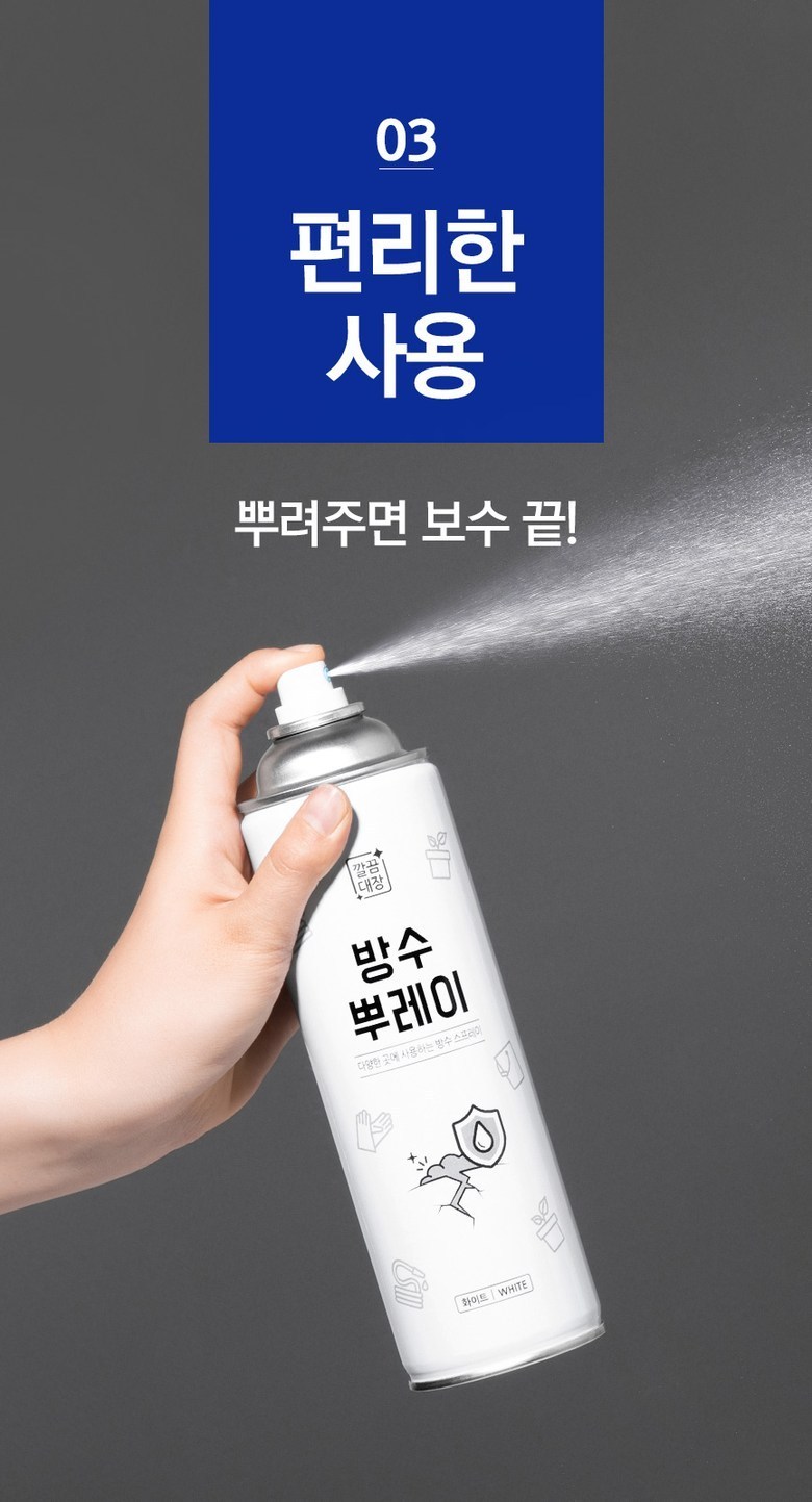 | 품목 및 제품명 | 특수목적코팅제,접합제,녹 방지제/방수뿌레이(투명) | 용도(표백제의 경우 계열을 함께표시) 및 제형 | 일반용-발수용,일반용-오염 방지용,일반용-표면보호용,자동차용-외부용,일반용-방수용,흠집충진용,이음매접합용,틈새충진용,금속용,차량용/분사형-스프레이형 |