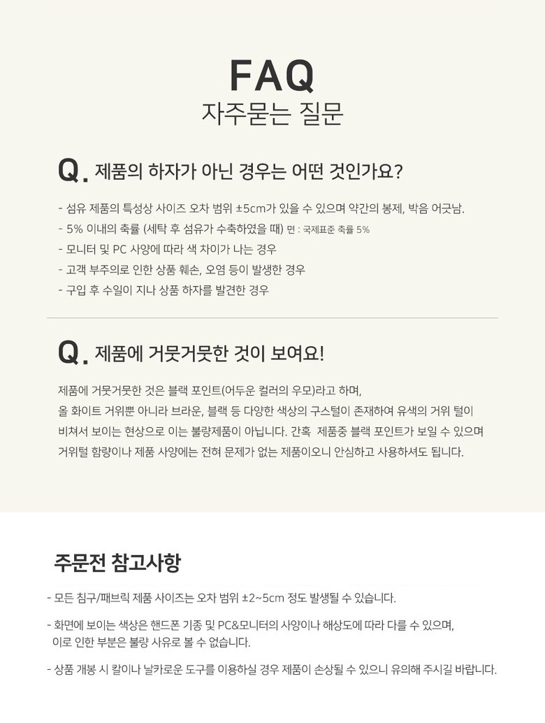 - ㆍ모니터 해상도의 차이로 인해 색상이나 이미지가 실제와 달라, 고객이 단순 변심으로 교환/반품을 무료로 요청하는 경우