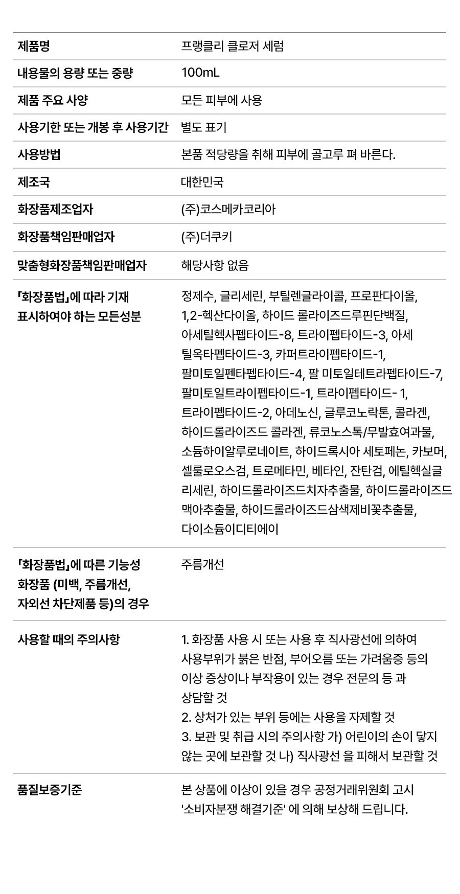 | 화장품제조업자, 화장품책임판매업자 및 맞춤형화장품판매업자 | 컨텐츠 참조 | 제조국 | 컨텐츠 참조 |