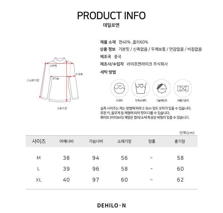 | 제조국 | 중국OEM | 세탁방법 및 취급시 주의사항 | 상품 상세페이지 참조 |