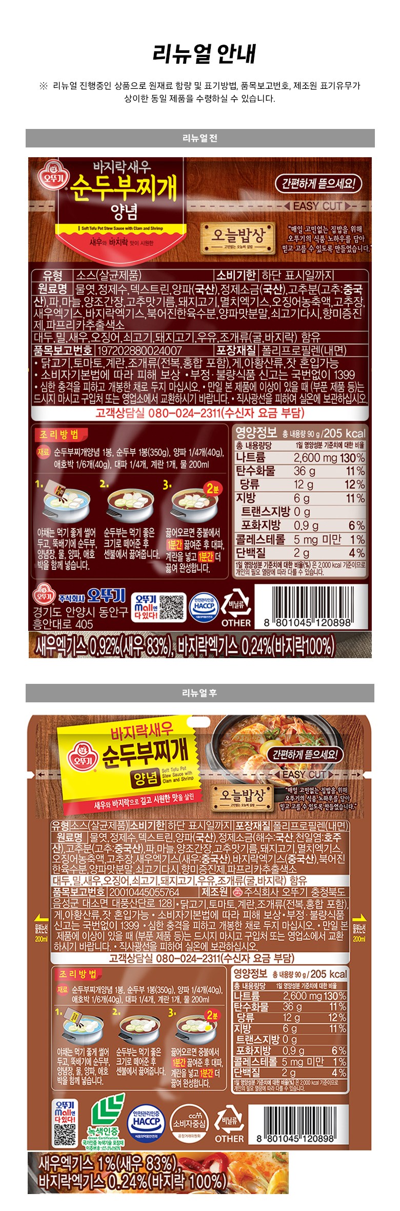 | 생산자 및 소재지 | 리뉴얼 전,후: 컨텐츠 참조 | 제조연월일, 소비기한 또는 품질유지기한 | 소비기한(또는 유통기한) : 2026년 08월 26일 이거나 그 이후인 상품 제조년월일 : 2025년 06월 03일 이후인 제조상품 |