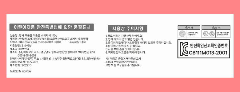 | 품명 및 모델명 | 탐사 두툼 미술용 스케치북 170g 3개입 | KC 인증정보 | CB111M013-2001 |