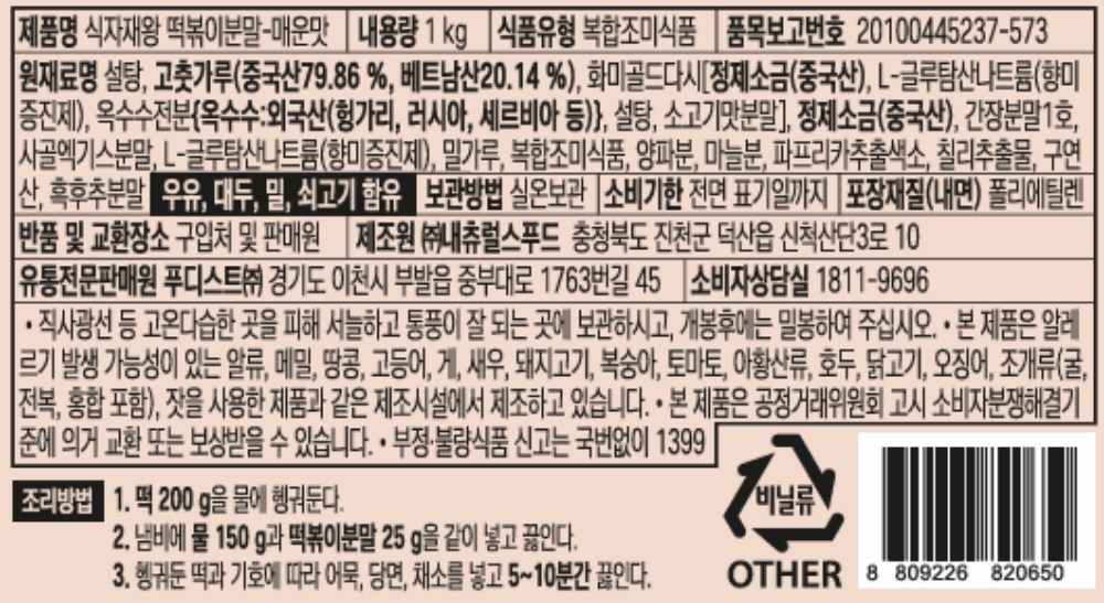 | 포장단위별 내용물의 용량(중량), 수량 | 1kg x 2개 | 원재료명 및 함량 | 컨텐츠 참조 |