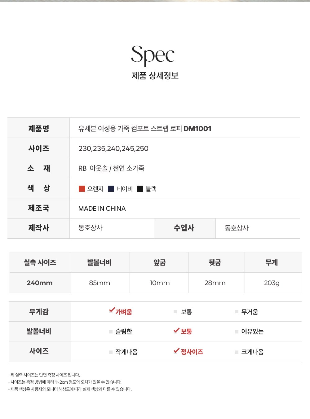 | 제조국 | 중국 | 취급시 주의사항 | 가급적 물세탁은 피해주시고, 장시간 직사광선에 노출 시 신발의 변형이 있을 수 있습니다. |