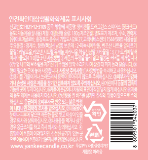 | 품목 및 제품명 | 방향제, 양키캔들 프래그런스 스피어스 (핑크샌드) | 용도(표백제의 경우 계열을 함께표시) 및 제형 | 자동차용-실내용, 비분사형-에멀션형 |
