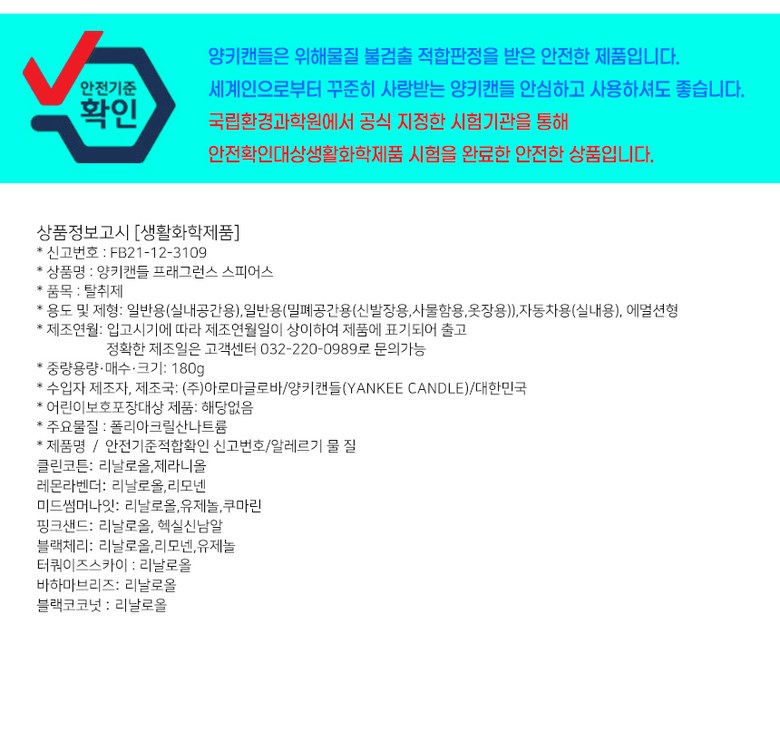 | 품목 및 제품명 | 상품 상세페이지 참조 | 용도(표백제의 경우 계열을 함께표시) 및 제형 | 상품 상세페이지 참조 |