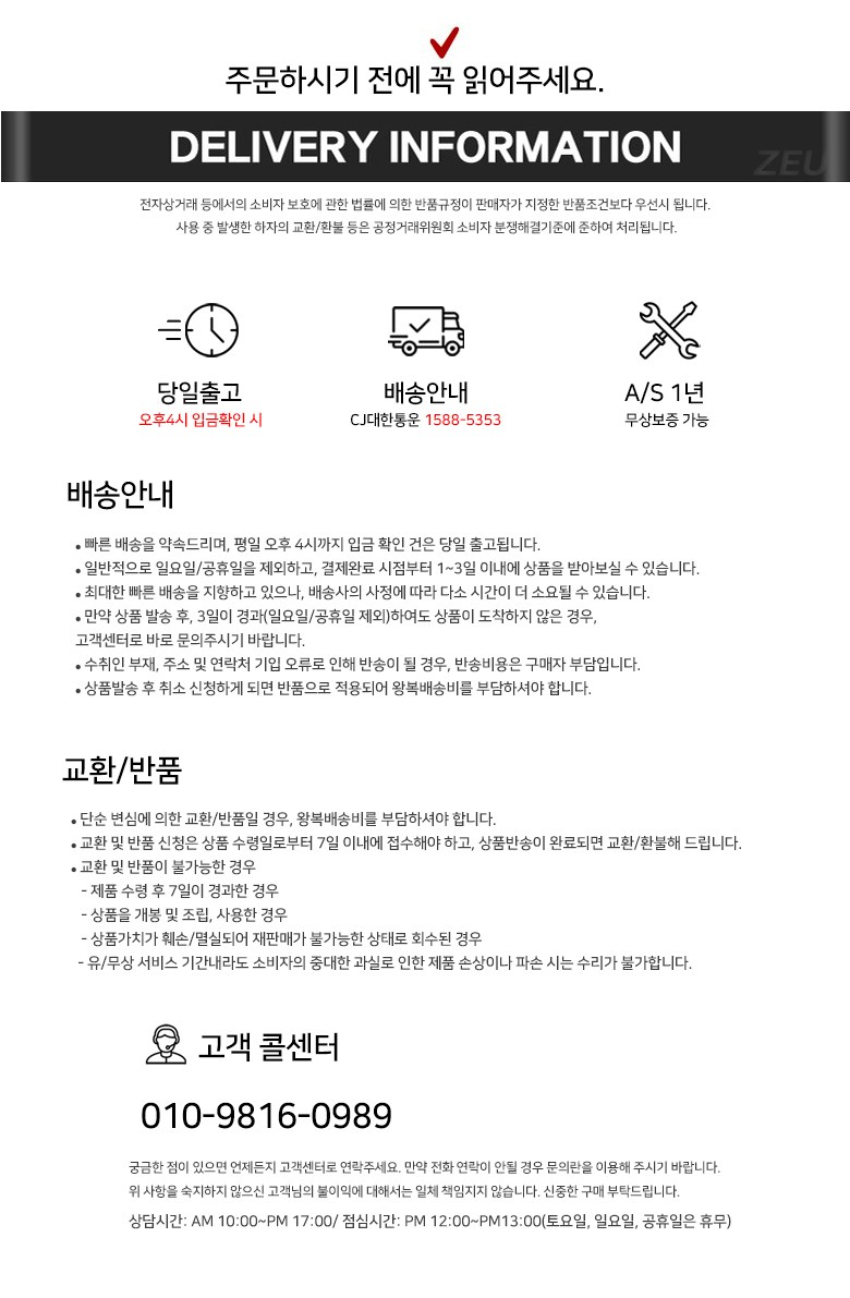 - ㆍ교환/반품에 관한 일반적인 사항은 판매자가 제시사항보다 관계법령이 우선합니다.