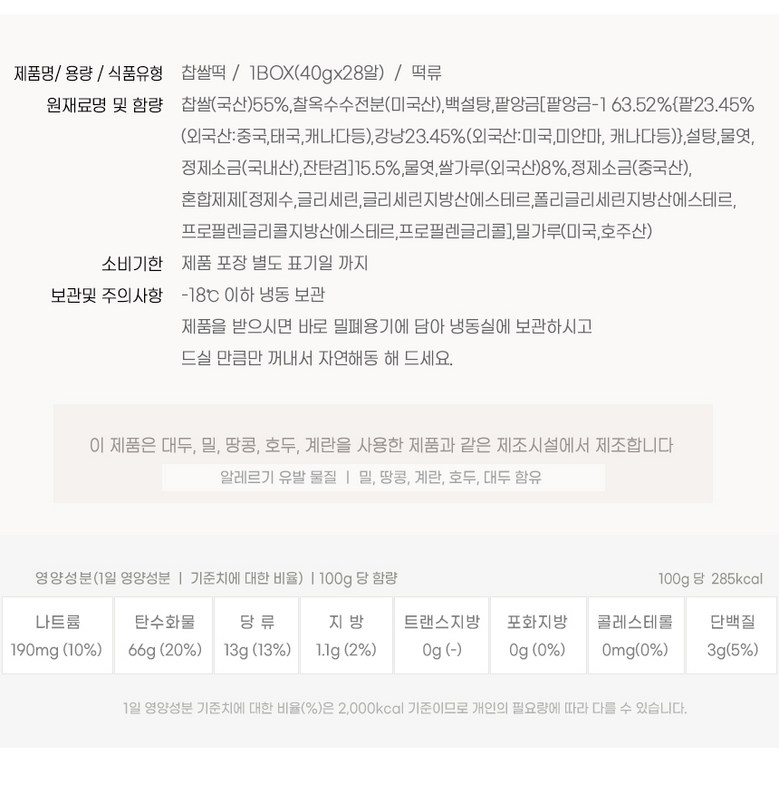 | 제품명 | 찹쌀떡 | 식품의 유형 | 떡류 |