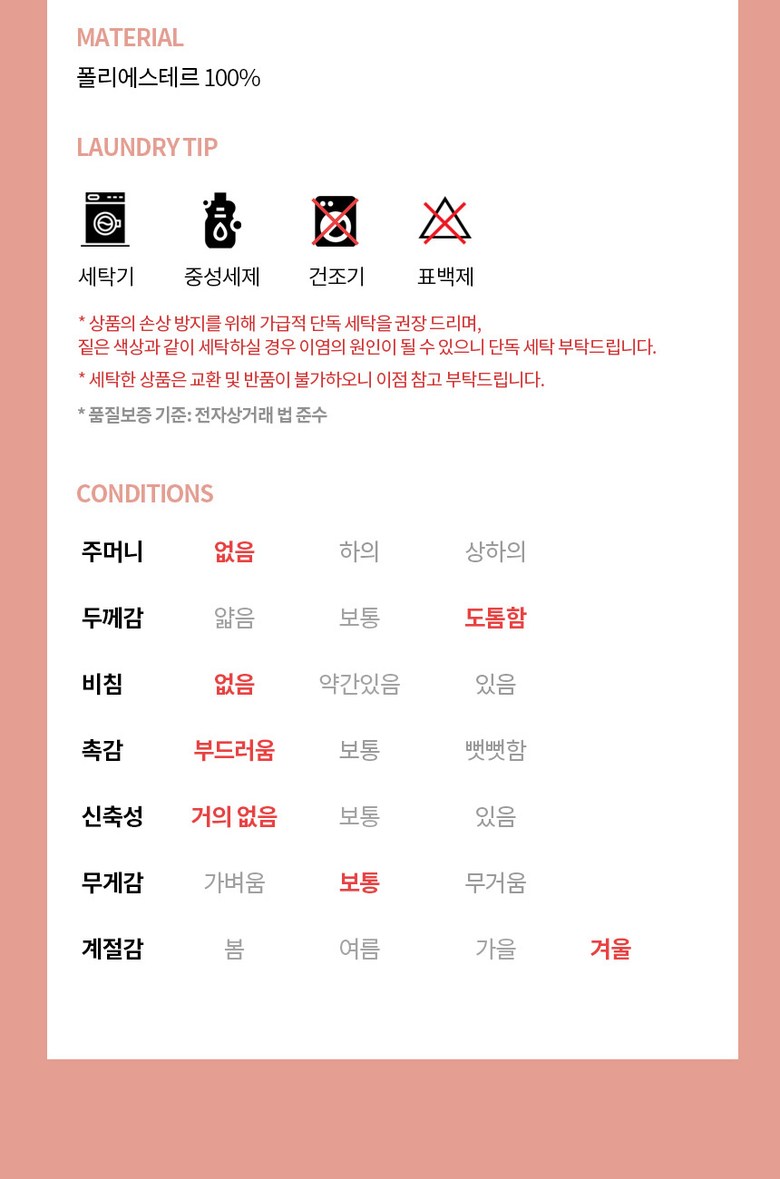 | 제조국 | 중국 | 세탁방법 및 취급시 주의사항 | 제품 이상 시 공정거래위원회 고시 소비자분쟁해결기준에 의거 보상합니다. |