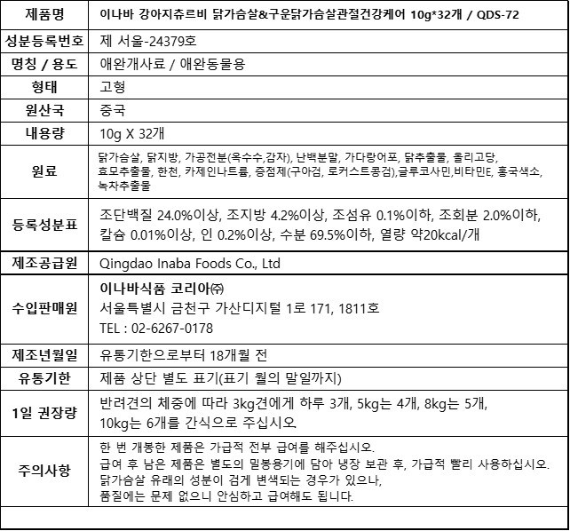 | 품명 및 모델명 | 이나바 츄르비 구운 닭가슴살 관절건강배려 (QDS-72) | 인증사항 | 사료관리법에 따른 성분등록번호 : 컨텐츠 참조 |
