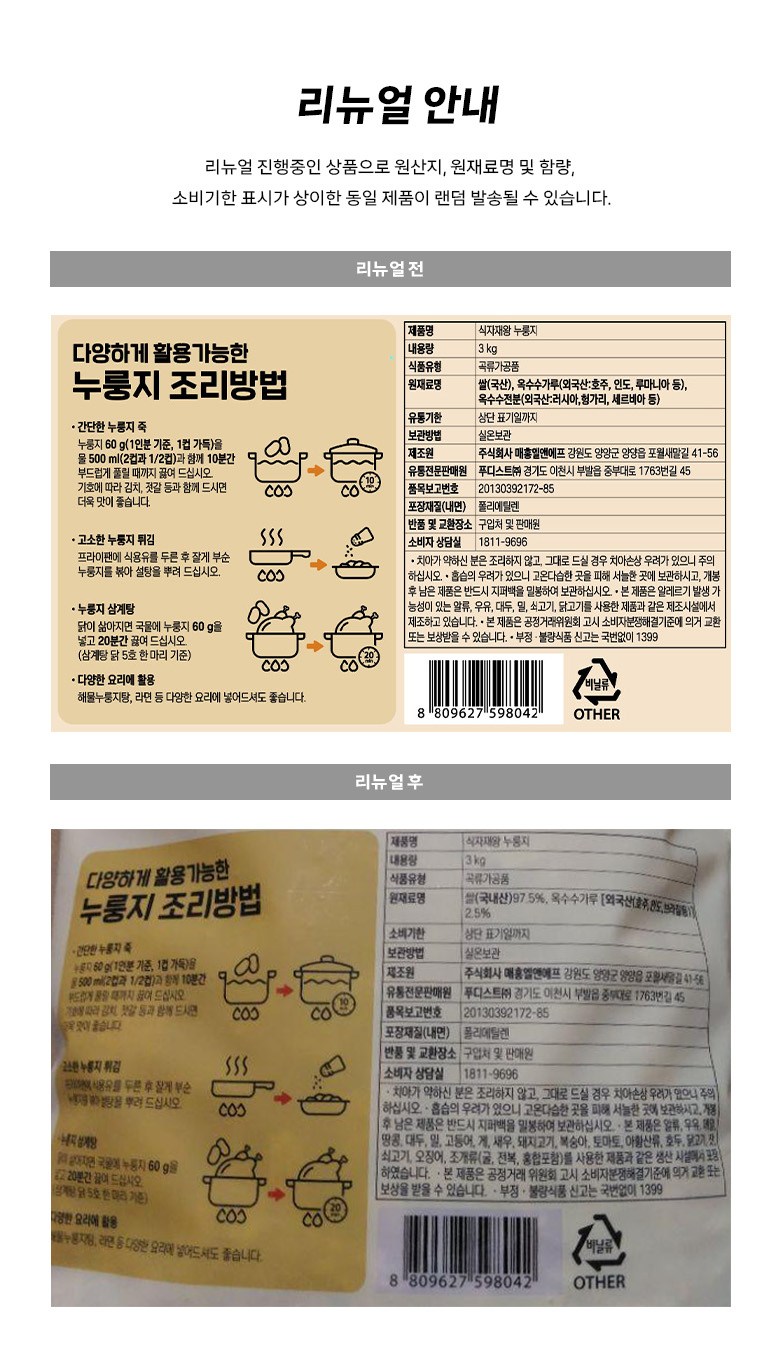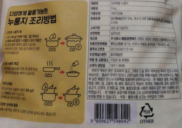 | 포장단위별 내용물의 용량(중량), 수량 | 3kg, 1개 | 원재료명 및 함량 | 컨텐츠 참조 |