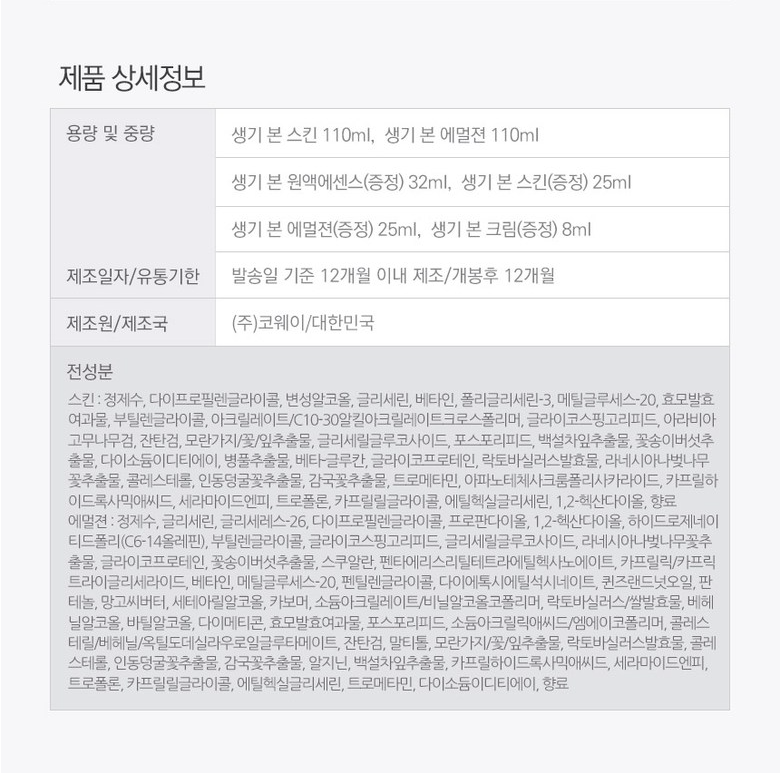 | 화장품제조업자, 화장품책임판매업자 및 맞춤형화장품판매업자 | 상품 상세페이지 참조 | 제조국 | 상품 상세페이지 참조 |
