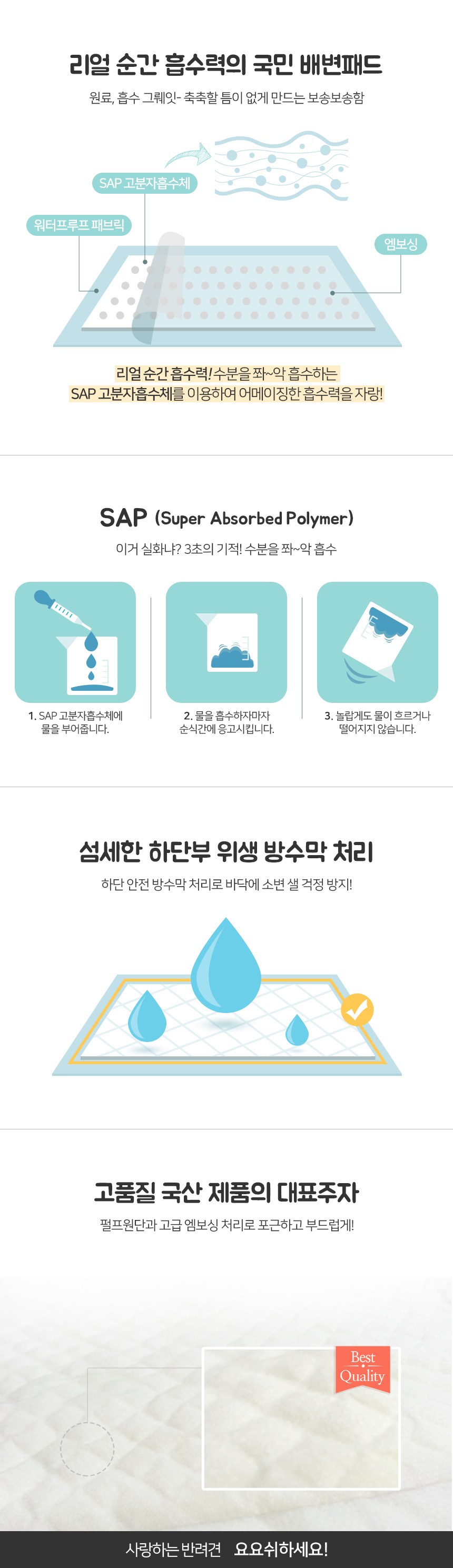 - 흡수력: 고흡수성수지 (SAP) 포함