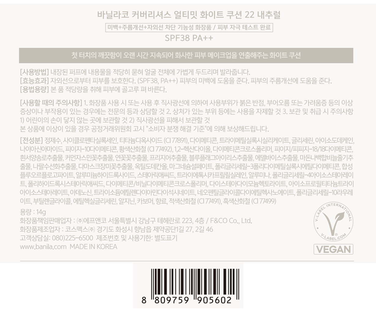 | 화장품제조업자, 화장품책임판매업자 및 맞춤형화장품판매업자 | 코스맥스(주) / (주)에프앤코 | 제조국 | 대한민국 |