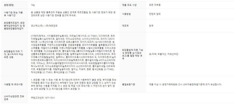 | 화장품제조업자, 화장품책임판매업자 및 맞춤형화장품판매업자 | 상품 상세페이지 참조 | 제조국 | 상품 상세페이지 참조 |