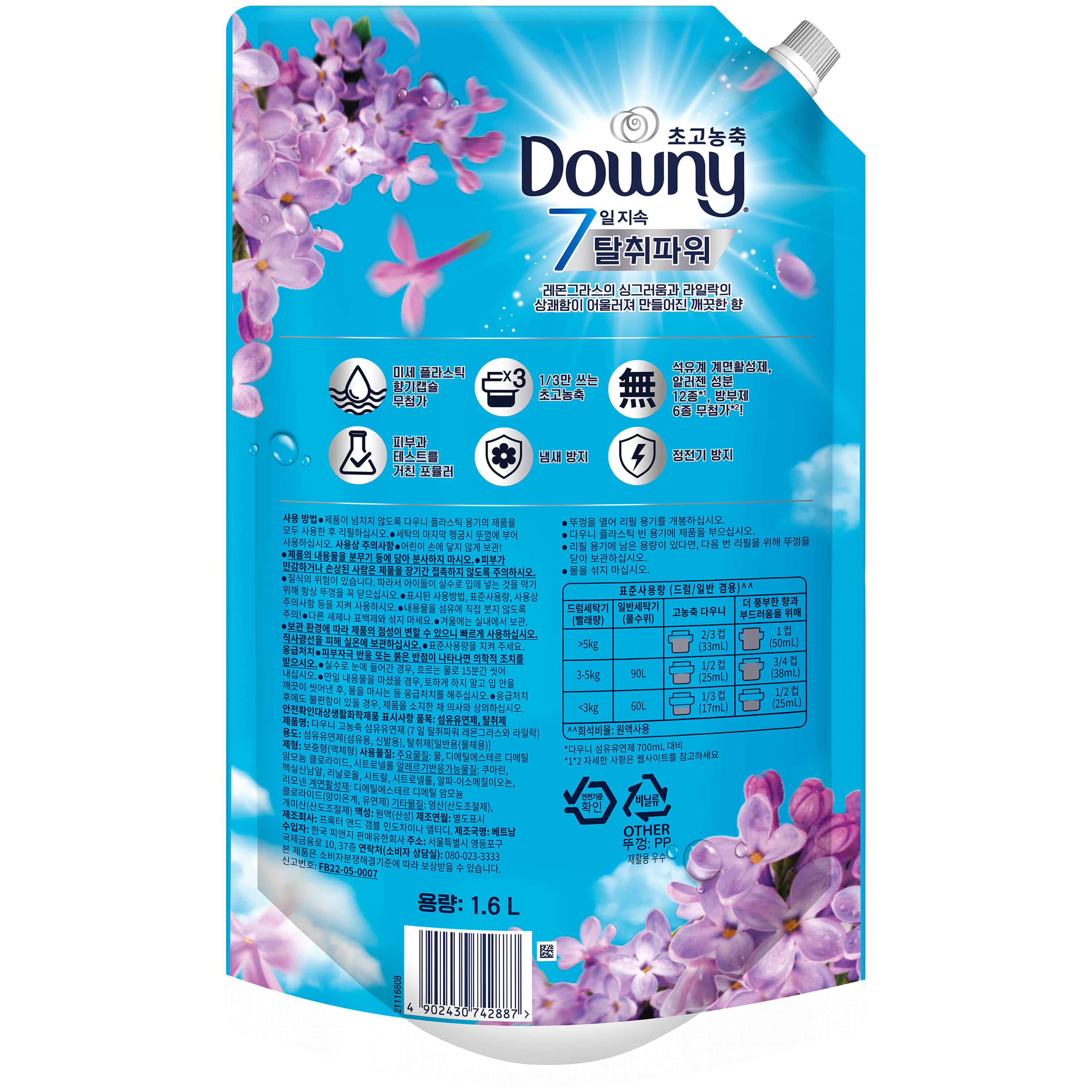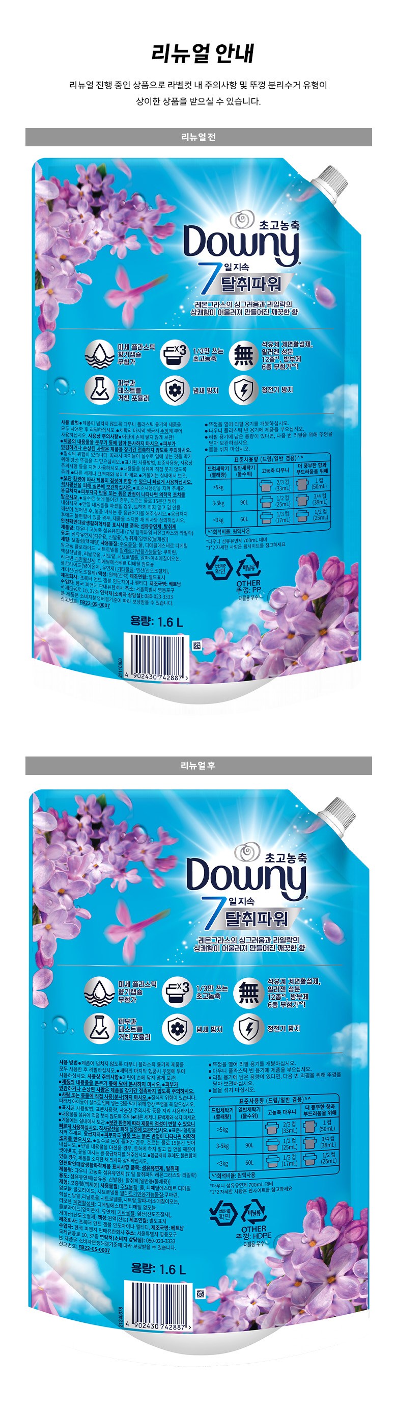 | 품목 및 제품명 | 섬유유연제,탈취제 / 다우니 고농축 섬유유연제 (7일 탈취파워 레몬그라스와 라일락) | 용도(표백제의 경우 계열을 함께표시) 및 제형 | 섬유유연제(섬유용, 신발용), 탈취제[일반용(물체용)] / 보충형(액체형) |
