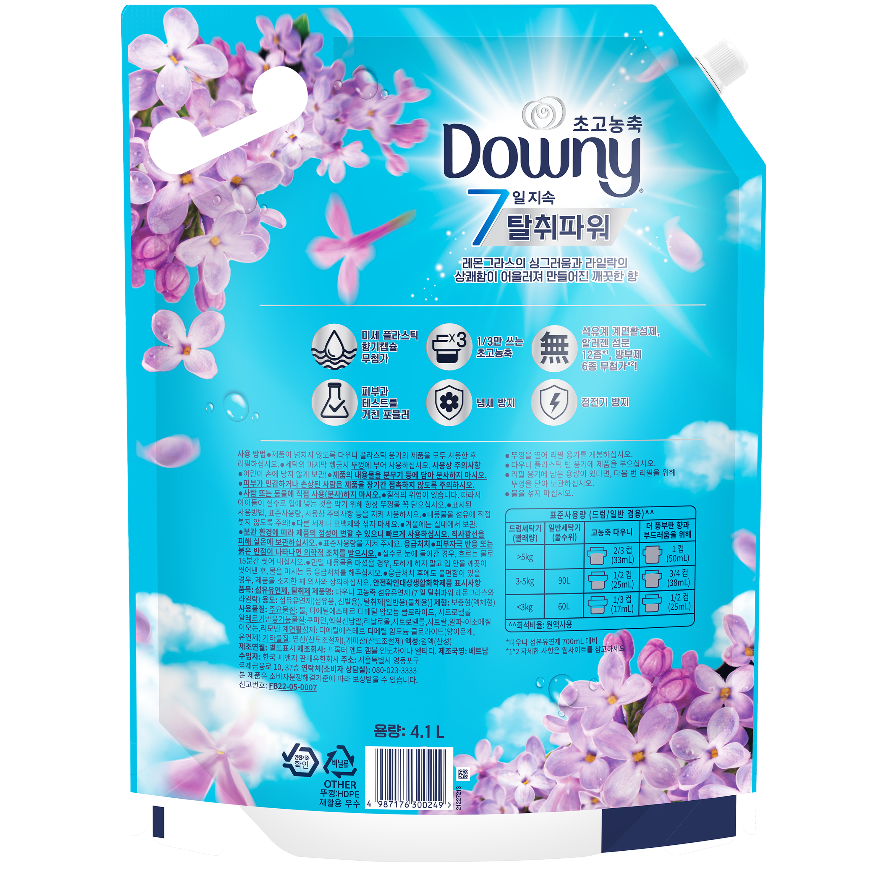 | 품목 및 제품명 | 섬유유연제, 탈취제 / 다우니 고농축 섬유유연제 (7일 탈취파워 레몬그라스와 라일락) | 용도(표백제의 경우 계열을 함께표시) 및 제형 | 섬유유연제(섬유용, 신발용), 탈취제[일반용(물체용)] / 보충형(액체형) |
