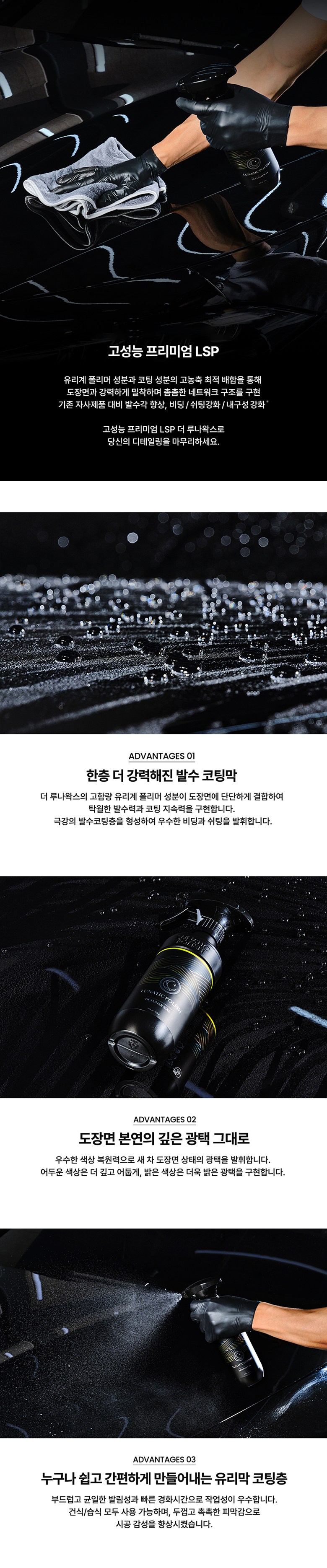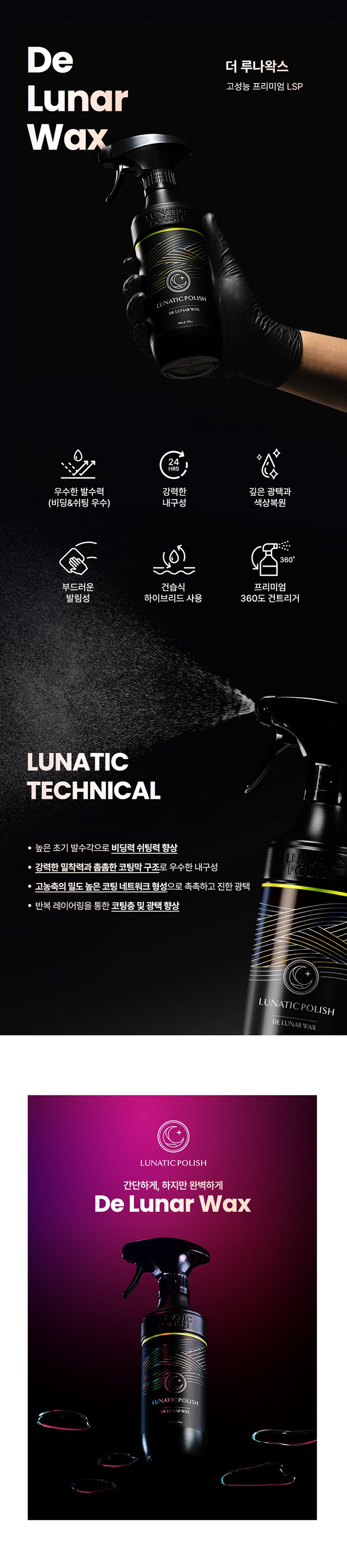 | 품목 및 제품명 | 광택코팅제, 특수목적코팅제/루나틱폴리시 더 루나왁스 | 용도(표백제의 경우 계열을 함께표시) 및 제형 | 광택코팅제 [일반용(플라스틱용),자동차용(외부용)], 특수목적 코팅제[일반용(발수용, 오염방지용, 표면보호용), 자동차용(외부용)] •제형: 보충형(분무기형), 액체형 |