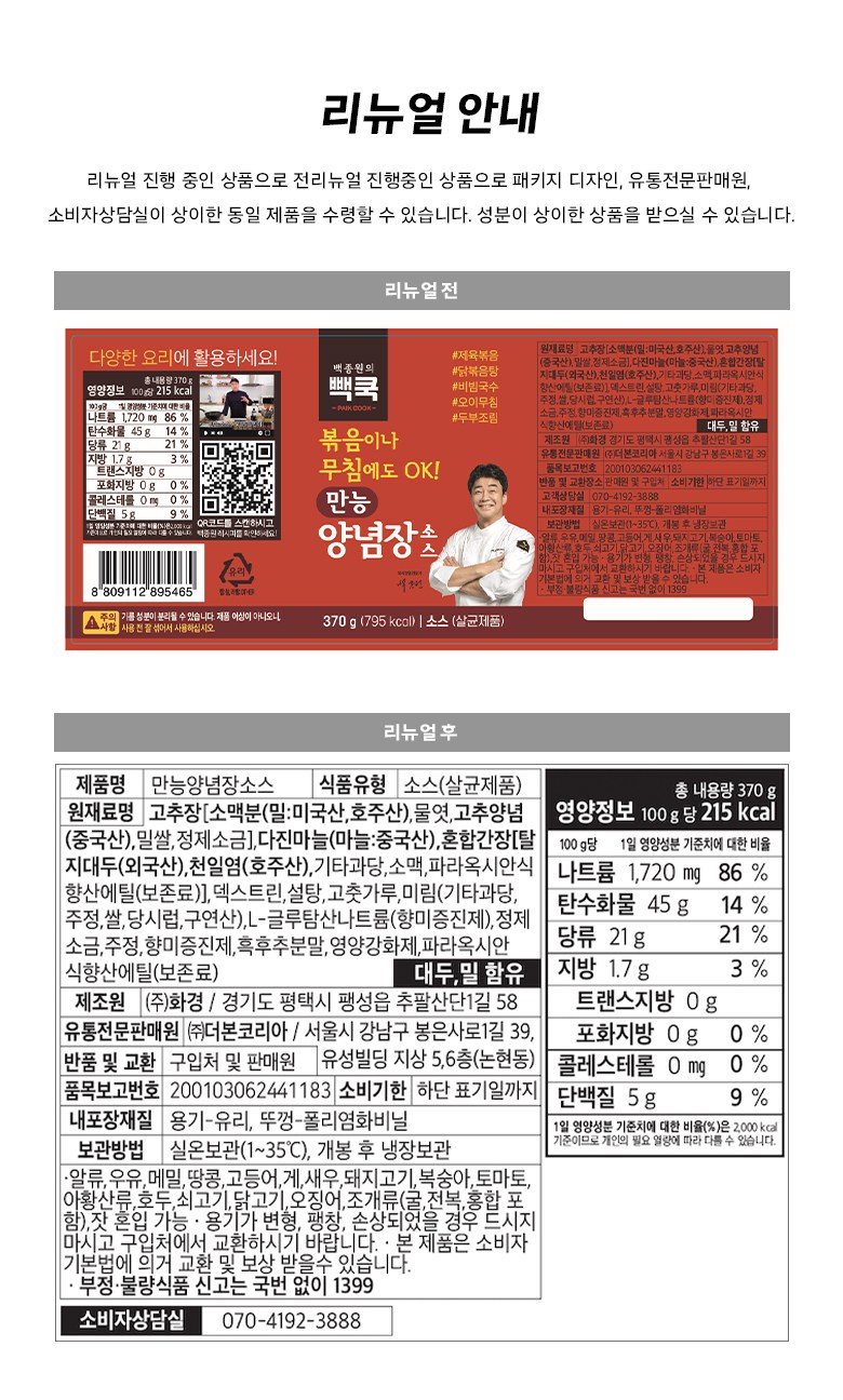 | 제품명 | 만능양념장소스 | 식품의 유형 | 컨텐츠 참조 |
