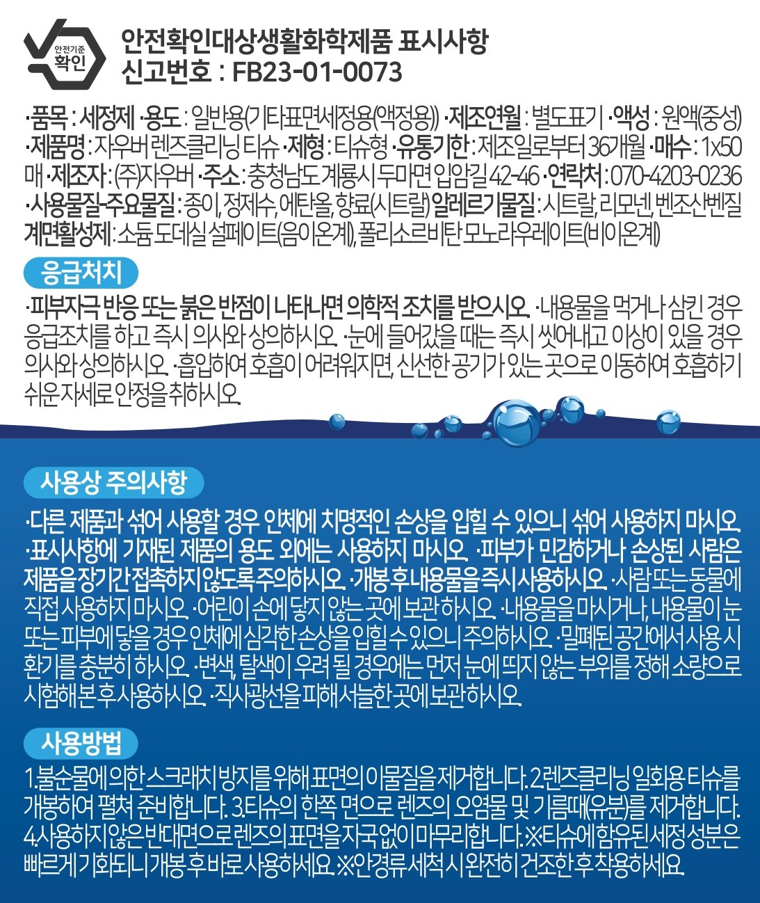 | 품목 및 제품명 | 세정제 / 자우버 렌즈클리닝 티슈 | 용도(표백제의 경우 계열을 함께표시) 및 제형 | 일반용-기타표면세정용(액정용) / 티슈형 |