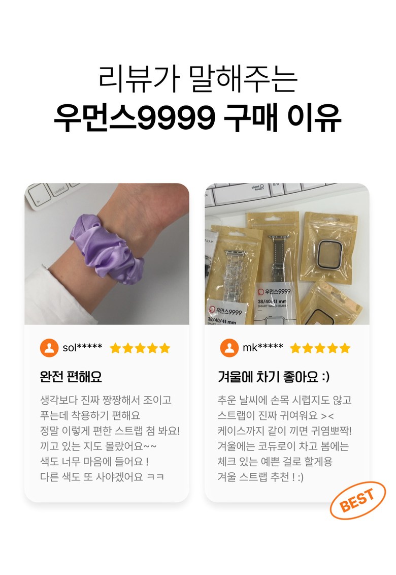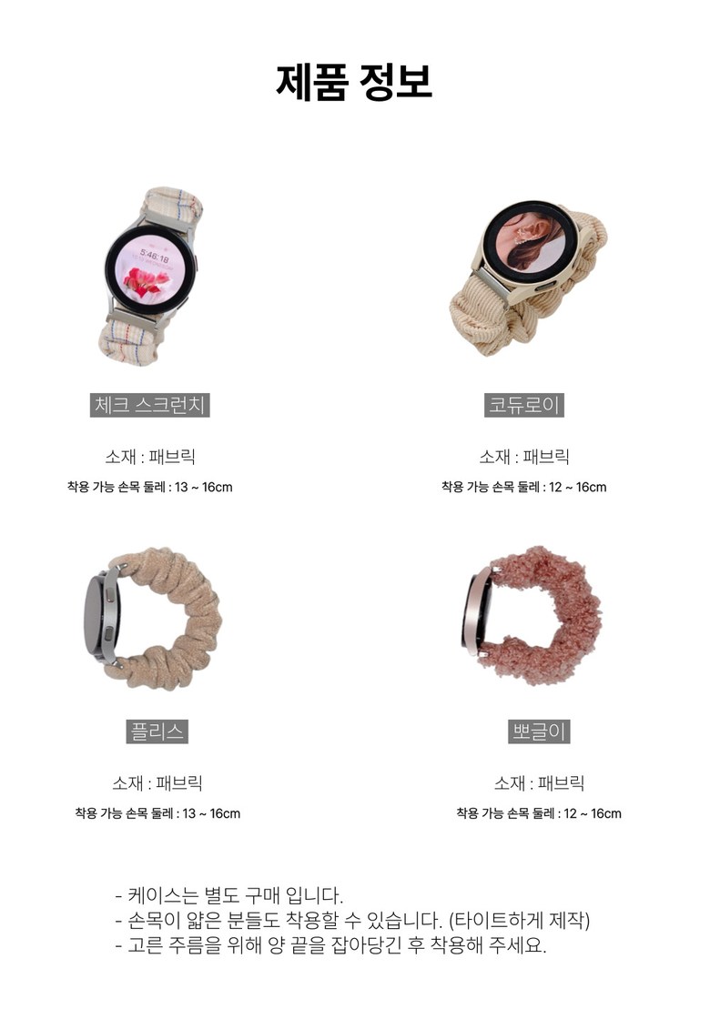 | 품명 및 모델명 | 우먼스9999 갤럭시워치 4/5 호환 가능 스크런치 밴드 스트랩 | 인증/허가 사항 | 해당없음 |