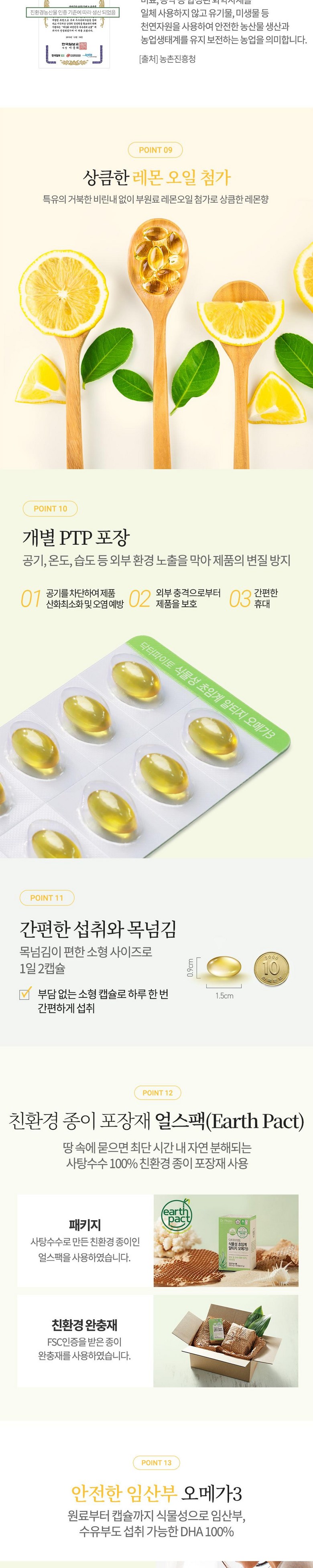 | 원료명 및 함량 | EPA 및 DHA 함유 유지{프랑스산/조류오일, d-토코페롤(혼합형), 로즈마리추출물}, d-α-토코페롤, 아마씨유(네덜란드산), 레몬오일(천연향료) [캡슐기제]정제수, 변성전분, 글리세린, 카라기난, 덱스트린 | 영양정보 | 1일섭취량: 2캡슐(1,000mg), 1일 섭취량 당 함량 : 열량 9kcal, 탄수화물 0g(0%), 단백질 0g(0%), 지방 1g(2%), 나트륨 0mg(0%), EPA와 DHA의 합 600mg, 비타민E 3.3mg α-TE(30%) ※()안의 수치는 1일 영양성분 기준치에 대한 비율임 |