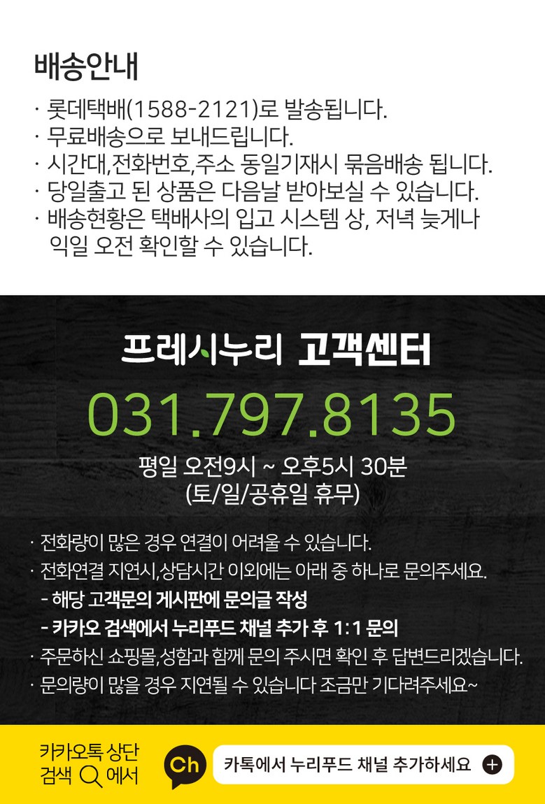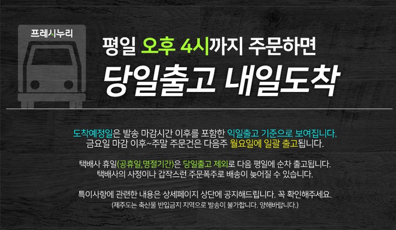 | 배송방법 | 신선/냉장/냉동 | 배송비 | 무료배송 - 도서산간 지역 배송불가 |