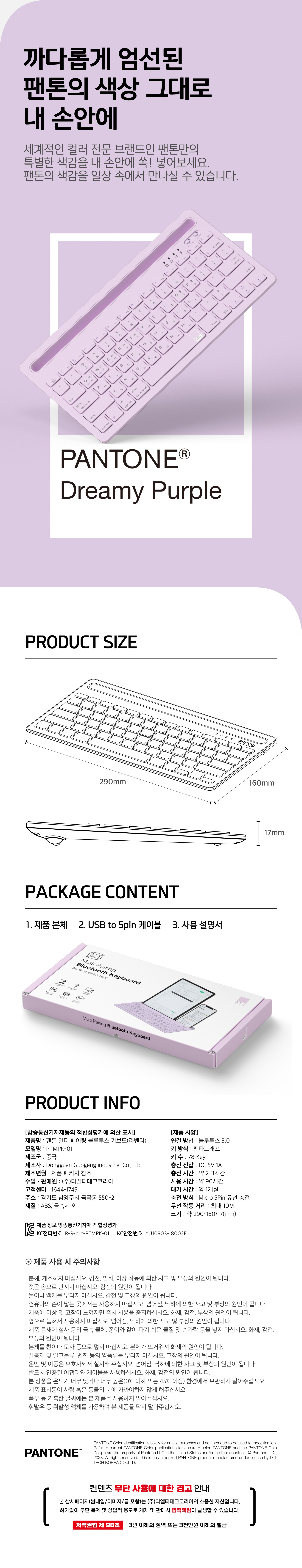 | 품명 및 모델명 | 블루투스 키보드/PTMPK-01 | KC 인증정보 | 본품: R-R-dLt-PTMPK-01, 배터리: YU10903-18002E |