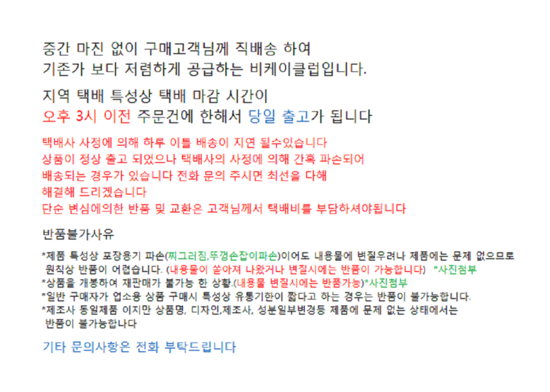 - ㆍ모니터 해상도의 차이로 인해 색상이나 이미지가 실제와 달라, 고객이 단순 변심으로 교환/반품을 무료로 요청하는 경우