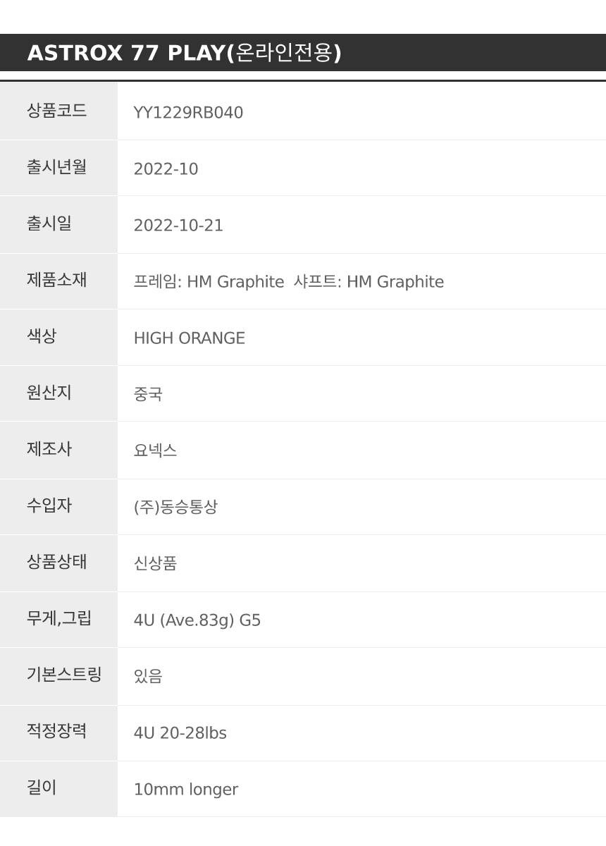 | 품명 및 모델명 | 요넥스 아스트록스 77 PLAY 배드민턴라켓 | KC 인증정보 | 해당없음 |