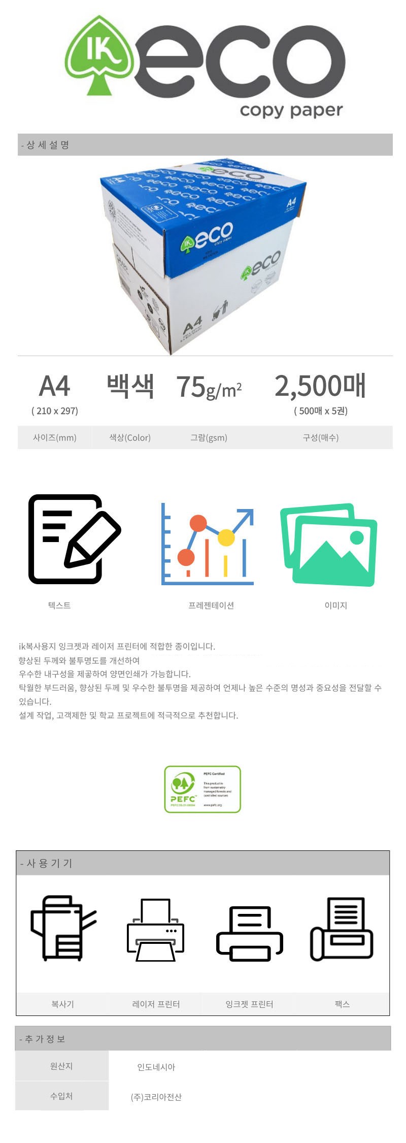 | 제조국(원산지) | 인도네시아 | 제조자(수입자) | PT. Indah Kiat Pulp & Paper Tbk. / (주)코리아전산 |