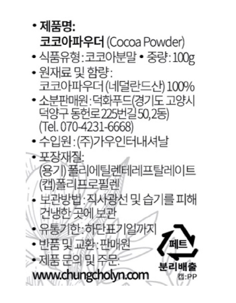 | 제품명 | 코코아파우더 | 식품의 유형 | 코코아분말 |