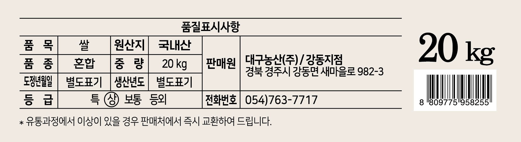 | 제조연월일, 소비기한 또는 품질유지기한 | 제조년월일 : 2025년 12월 05일 이후인 제조상품<br />생산일자 : 2025 | 세부 품목군별 표시사항 | 농수산물 : 유전자변형(해당 없음) / 지리적 표시사항(해당 없음) |