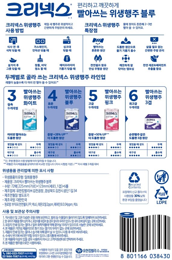 | 품명 및 모델명 | 크리넥스 빨아쓰는 위생행주 블루 | 인증/허가 사항 | 위생용품 |