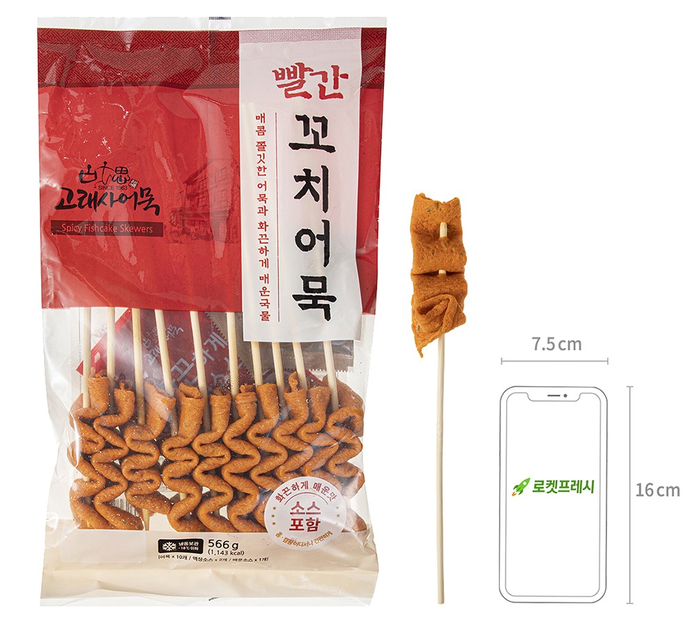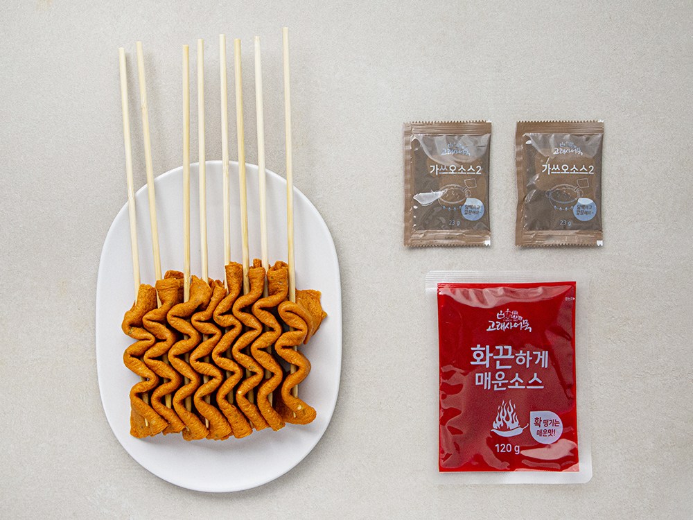 꼬치 어묵, 액상소스, 매운소스로 구성되어 있습니다.