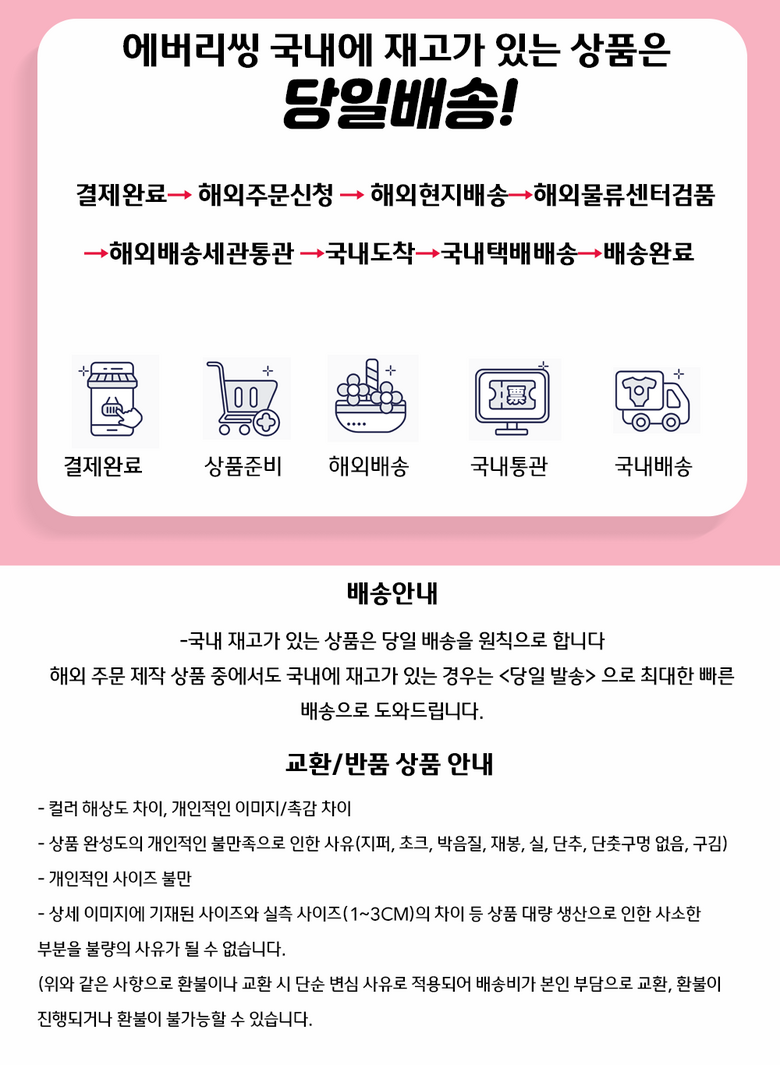 - ㆍ모니터 해상도의 차이로 인해 색상이나 이미지가 실제와 달라, 고객이 단순 변심으로 교환/반품을 무료로 요청하는 경우