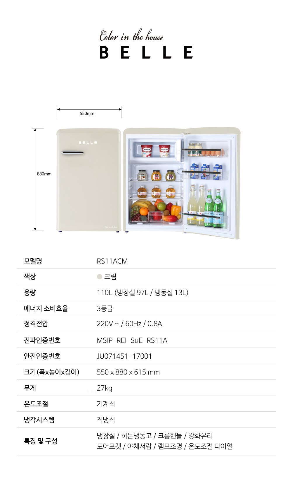 | 품명 및 모델명 | BELLE 레트로 글라스 소형 냉장고 110L 방문설치 크림 RS11ACM | KC 인증정보 | JU071451-17001, MSIP-REI-SuE-RS11A |