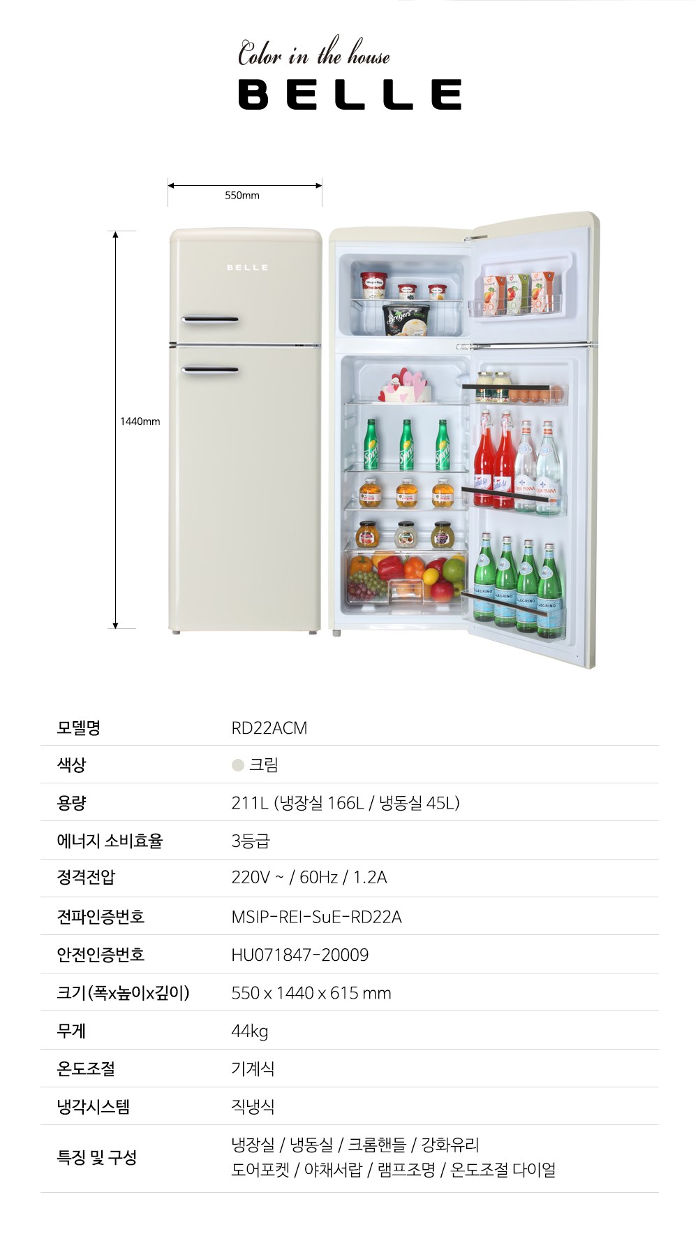 | 품명 및 모델명 | BELLE 레트로 글라스 소형 냉장고 211L 방문설치 크림 RD22ACM | KC 인증정보 | HU071847-20009A, MSIP-REI-SuE-RD22A |
