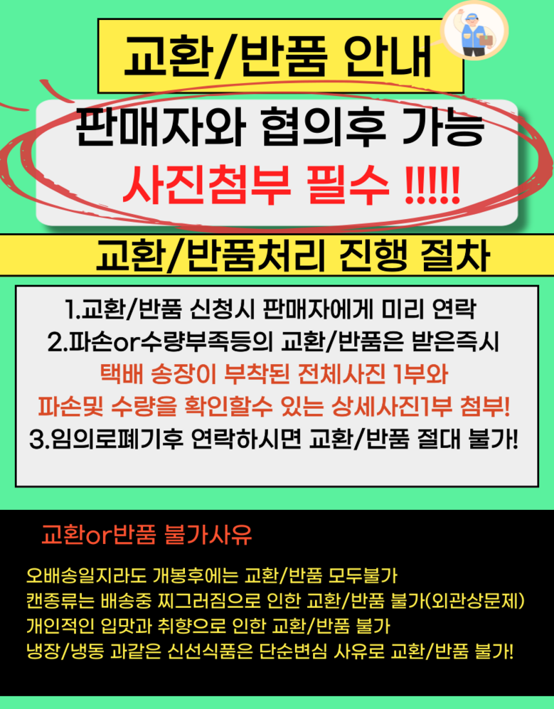 - ㆍ교환/반품에 관한 일반적인 사항은 판매자가 제시사항보다 관계법령이 우선합니다.