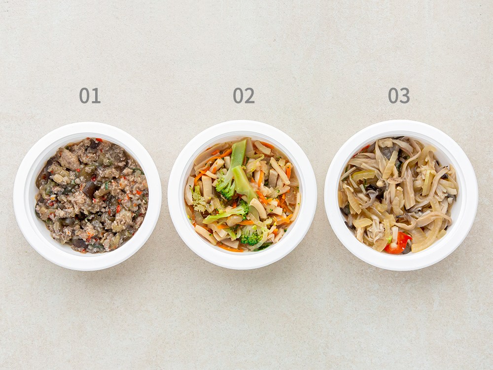 01 가지볶음 02 오징어 야채볶음 03 모듬 버섯볶음