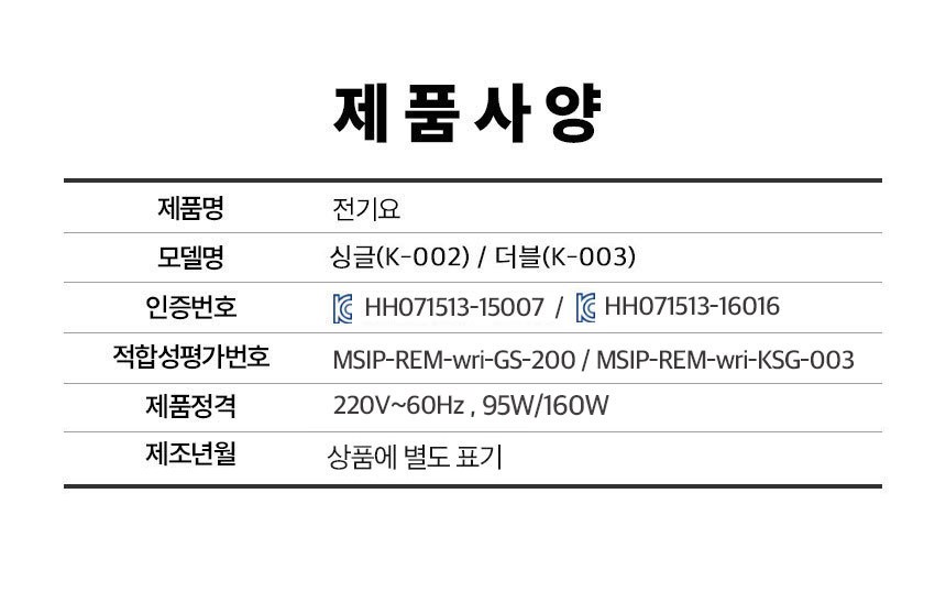| 품명 및 모델명 | 한일의료기 탄소 카본 피복 발열선 전기요 매트 / KSG-003 | KC 인증정보 | HH071513-16016F / MSIP-REM-wri-KSG-003 |