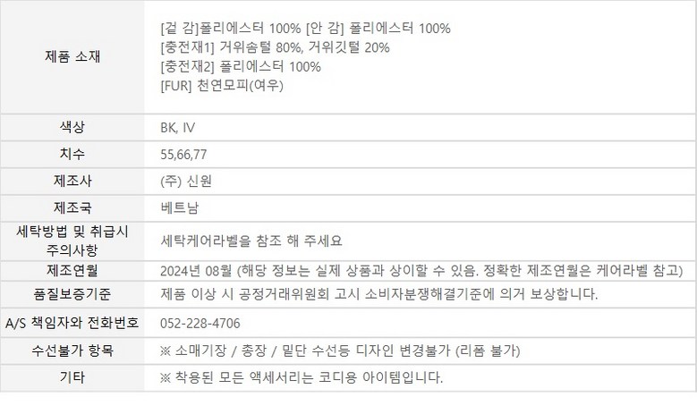 | 제조국 | 상품 상세페이지 참조 | 세탁방법 및 취급시 주의사항 | 상품 상세페이지 참조 |