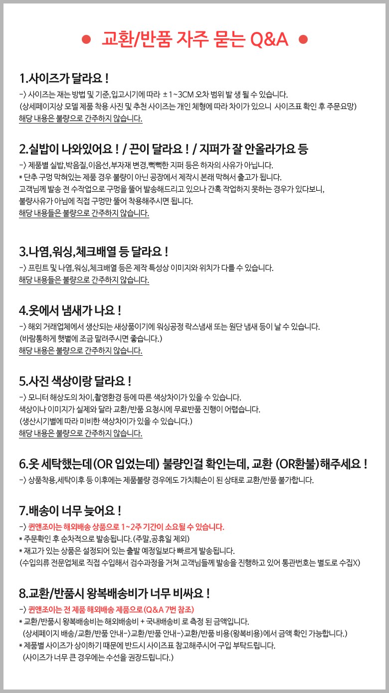 - ㆍ모니터 해상도의 차이로 인해 색상이나 이미지가 실제와 달라, 고객이 단순 변심으로 교환/반품을 무료로 요청하는 경우