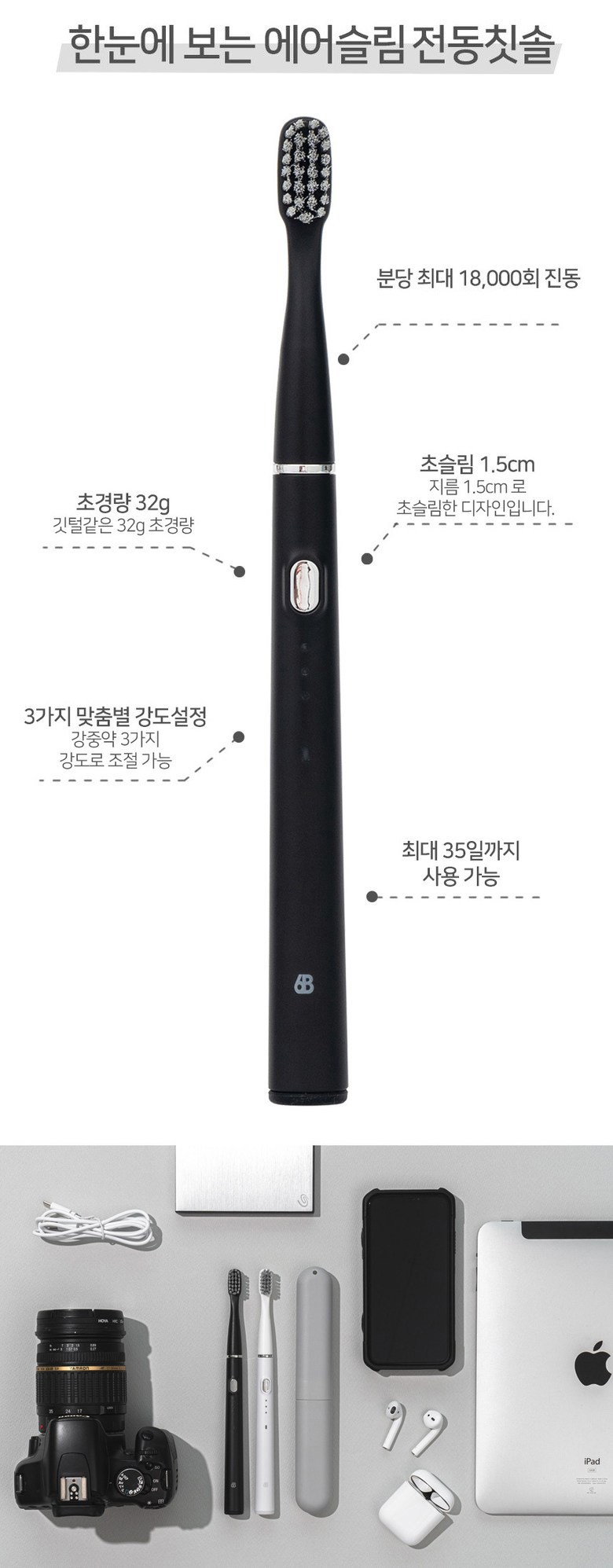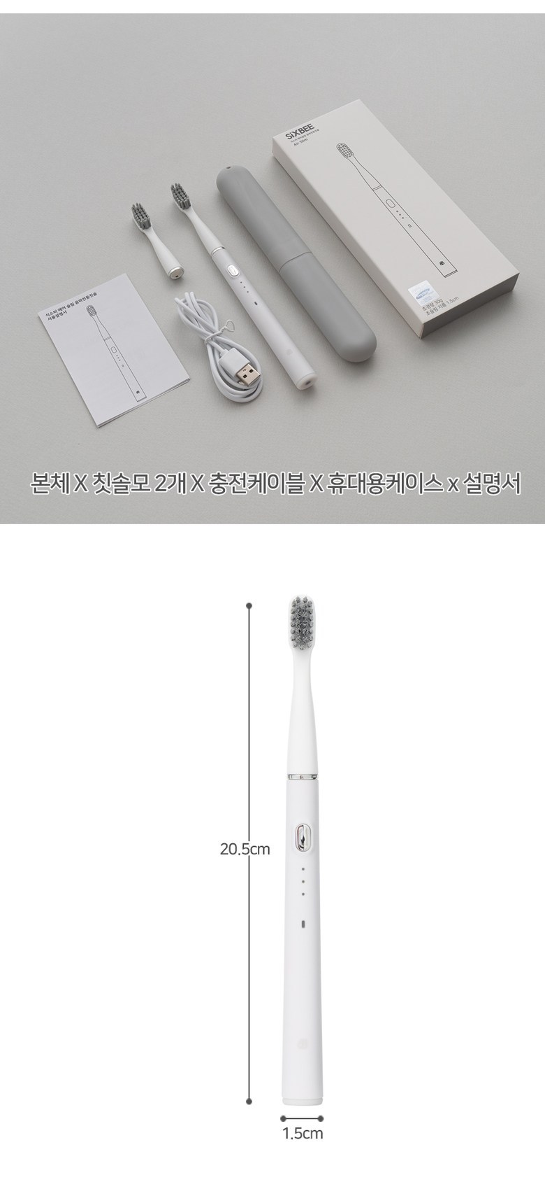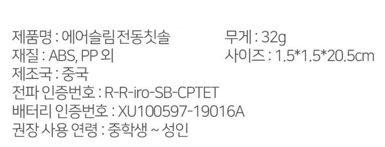 | 품명 및 모델명 | 식스비 휴대용 에어슬림 전동칫솔 / SB-CPTET | KC 인증정보 | 본품 : R-R-iro-SB-CPTET , 전지 : XU100597-19016A |