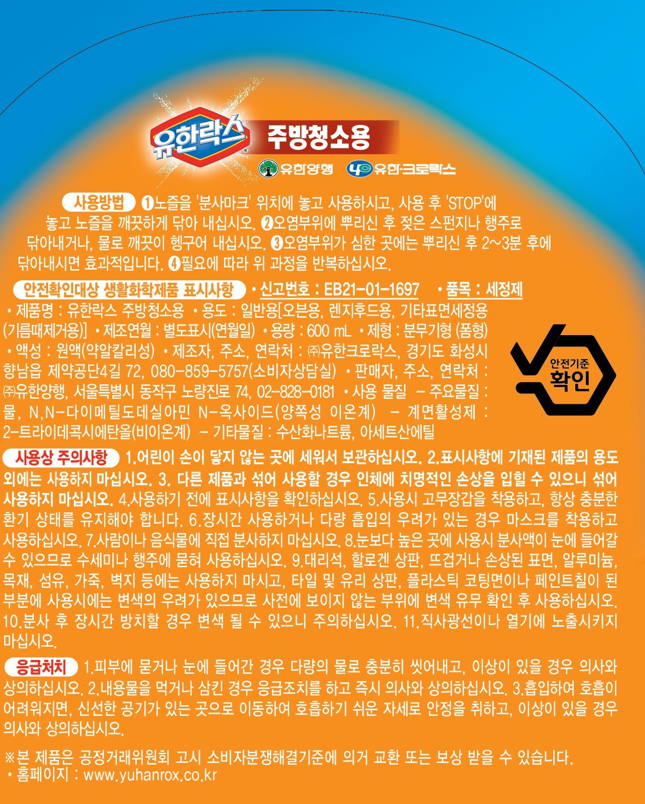 | 품목 및 제품명 | 세정제 / 유한락스 주방청소용 | 용도(표백제의 경우 계열을 함께표시) 및 제형 | 일반용[오븐용, 렌지후드용, 기타표면세정용(기름때제거용)] / 분무기형(폼형) |
