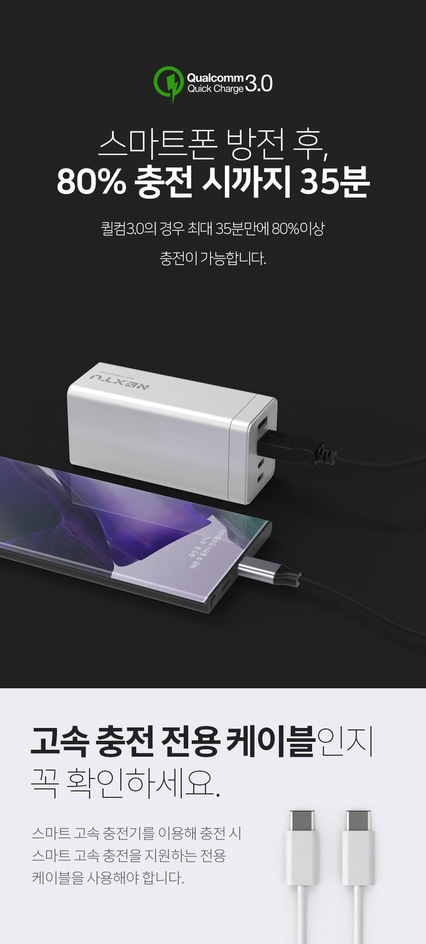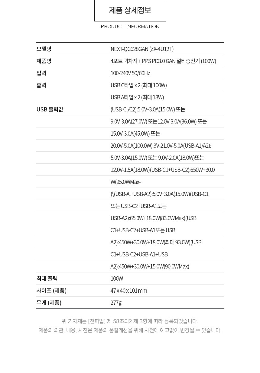 | 품명 및 모델명 | 휴대폰 충전기/NEXT-QC628GAN(ZX-4U12T) | KC 인증정보 | R-R-Zsi-ZX-4U12T, HU101101-22016A |
